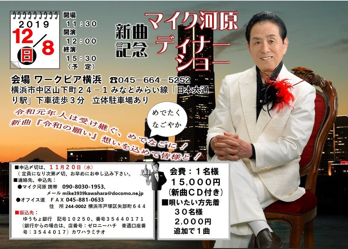 3. 12月13日に横浜市の「ワークピア横浜」で毎年年末恒例の「マイク河原ディナーショー」を開催します。マイク河原の歌の世界を堪能して頂くと共に、私の友人歌手や、歌好きなお客様にも楽しく唄って頂く企画です。コロナウイルスに負けずに、一年の締めを楽しく皆様と過ごしたく思っております。