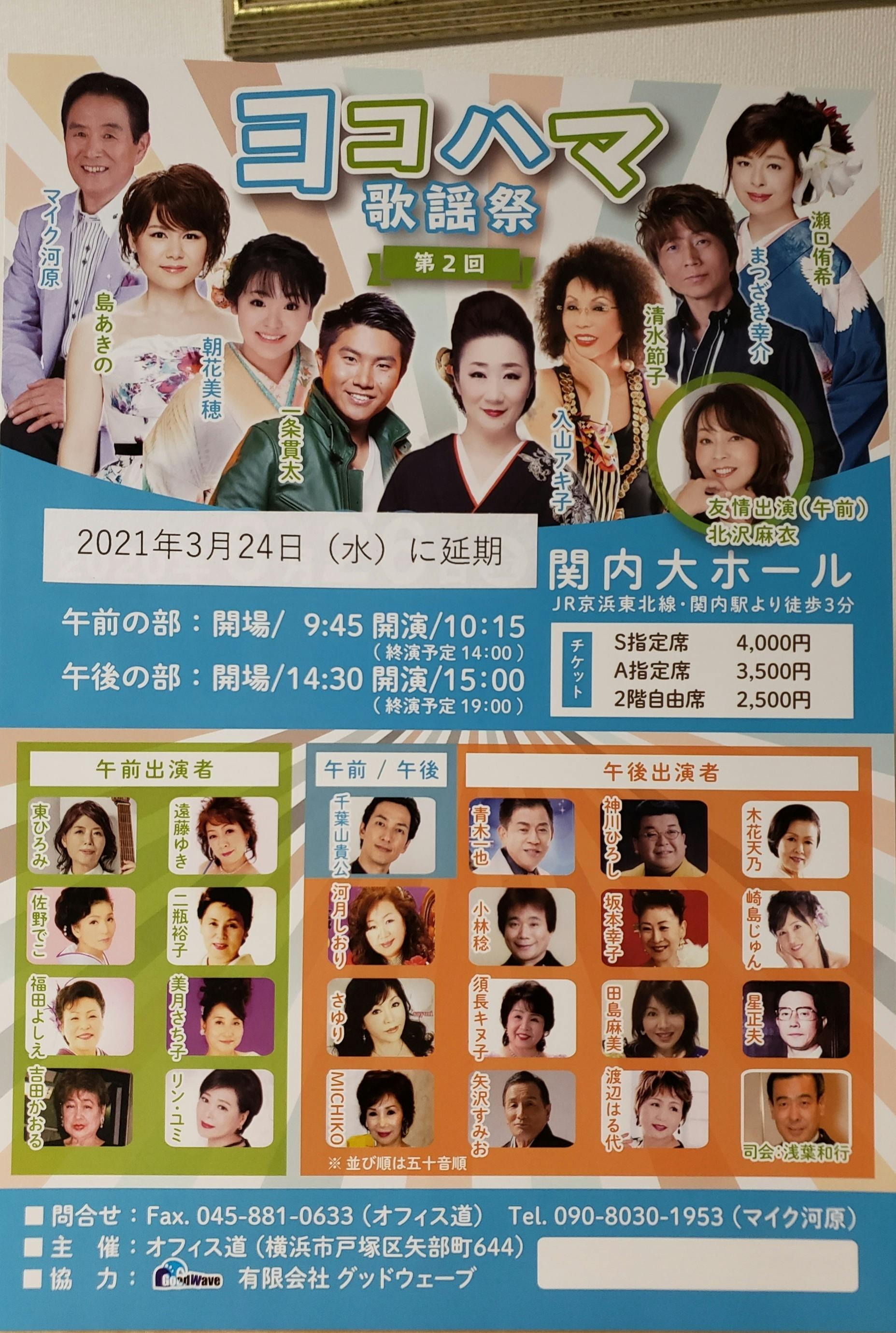 2. 6月26日開催予定だった「第2回ヨコハマ歌謡祭」は来年3月24日に延期して横浜市の「関内大ホール」で開催します。