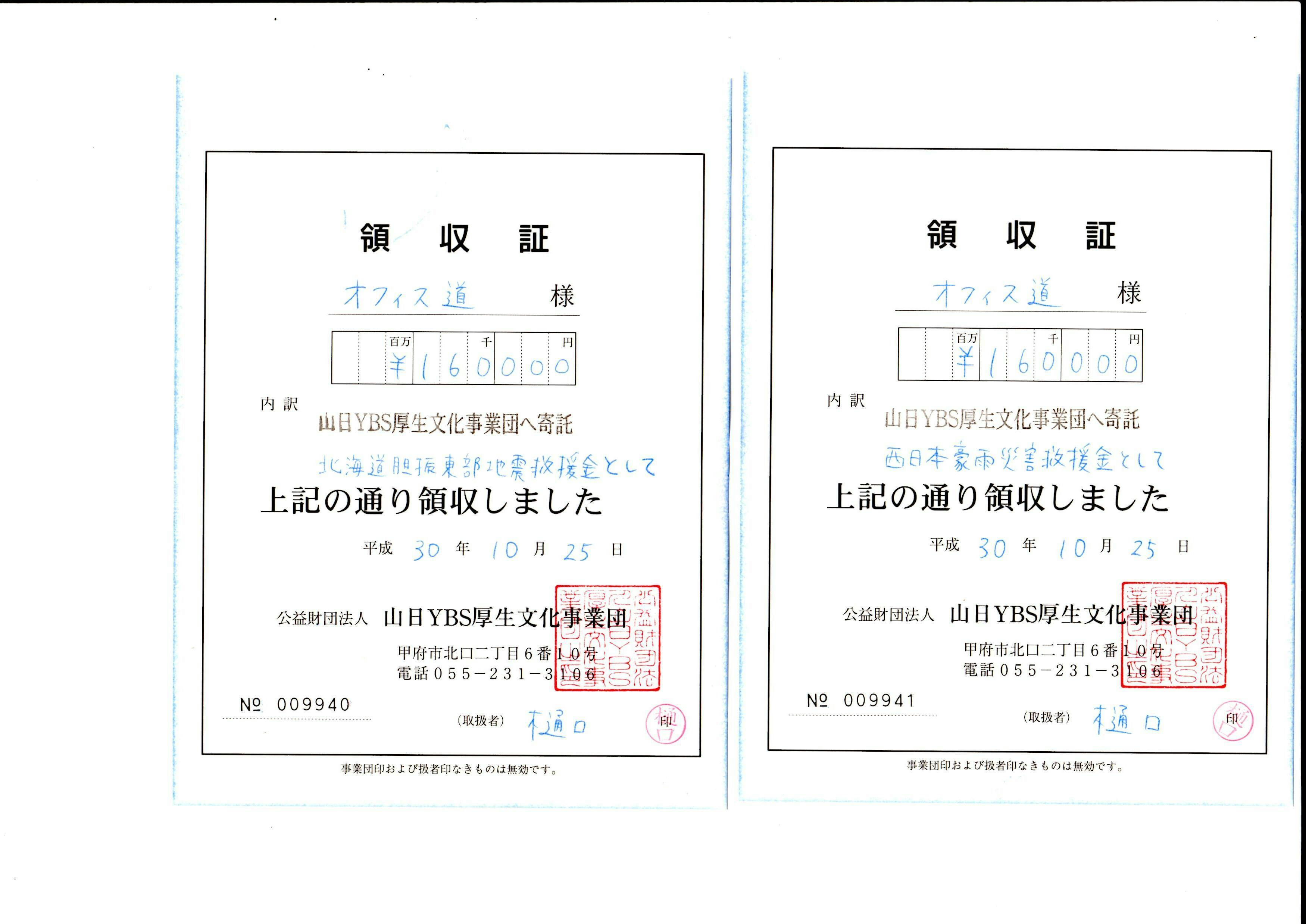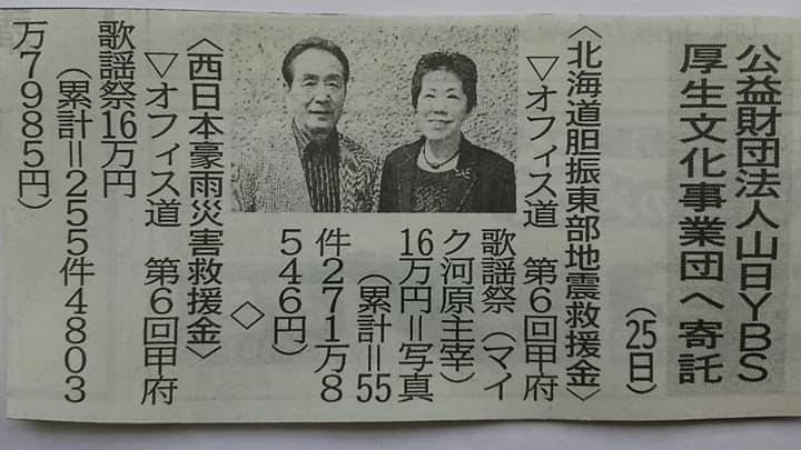 オフィス道は、2013年から山梨県甲府市の「YCC県民文化ホール(旧コラニー文化ホール)」で、昨年まで7年連続で震災復興チャリティーとして「甲府歌謡祭」を開催してきました。毎年30数万円を義援金として「YBS厚生文化事業団」様他を通して東日本大震災、熊本地震、北海道胆振地震、西日本豪雨の被災等にお送りしてきました。