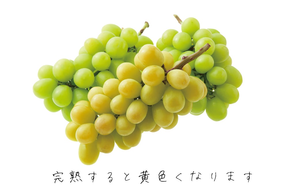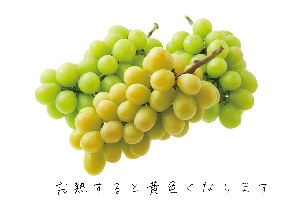 シャインマスカットは完熟すると皆さんが普段目にしている鮮やかな緑のシャインマスカットと違い、【黄色み】を帯びた落ち着いた色合いに変化します。緑のものがさっぱりとした甘さなのに対して、濃厚な甘みとなります。