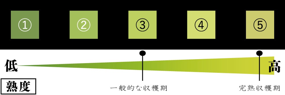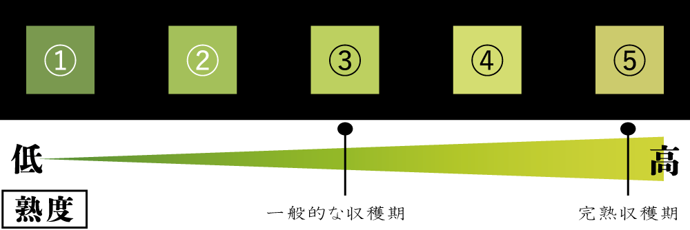 一方、⑤の色で完熟収穫されたものは糖度19度、場合によっては20度を超える甘さとなります。