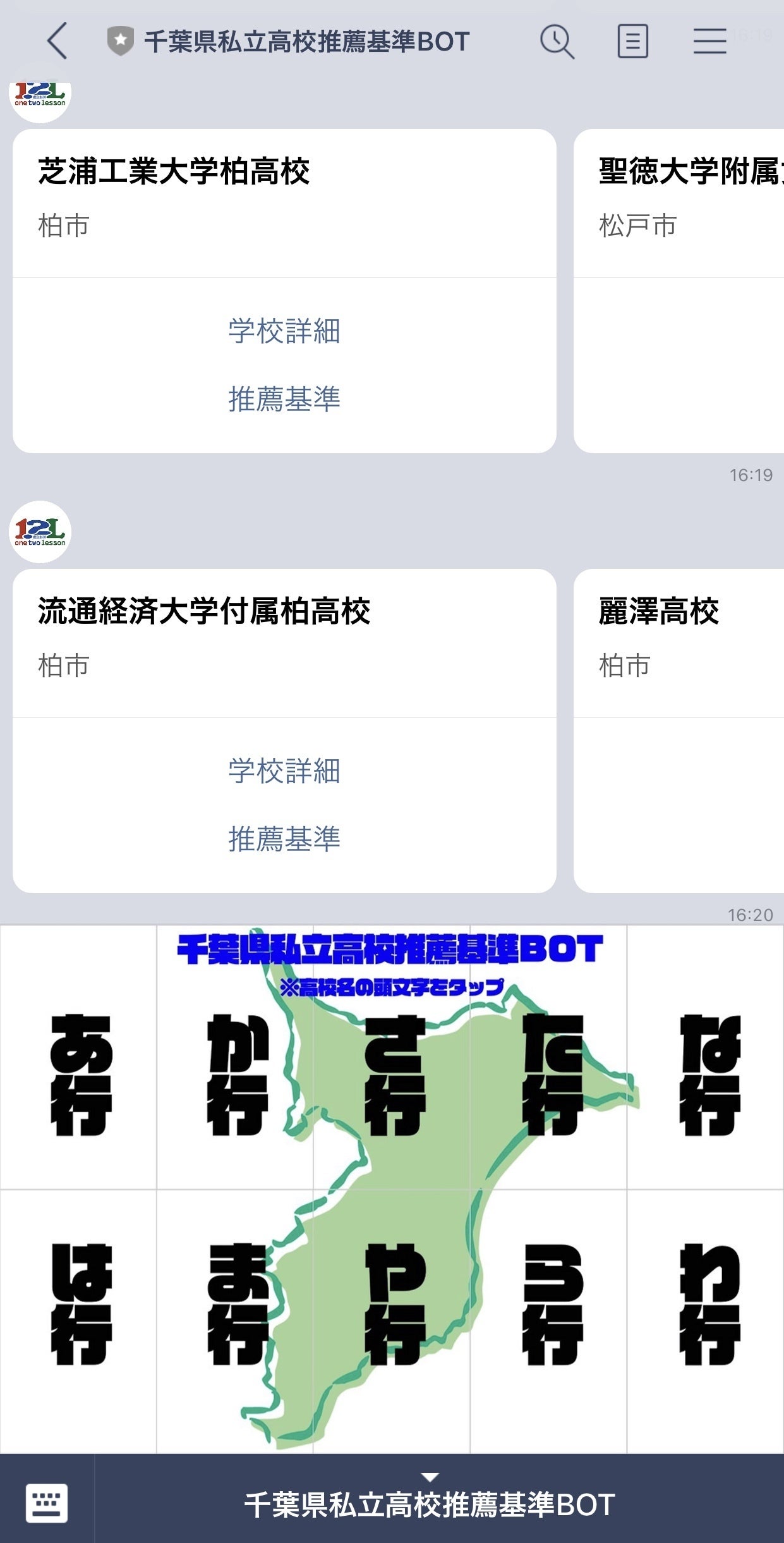 ・高校受験における情報の流動性は決して高くありません。特に私立高校の推薦基準については、高校側が公表しているにも関わらず、受験生やその保護者まで情報が行き届いてません。そうした状況を解決すべく、中学生やその保護者の間で使用率が高いメッセージアプリ「LINE」で、高校名をタップすると自動で推薦基準を教えてくれる当塾オリジナルbotです。