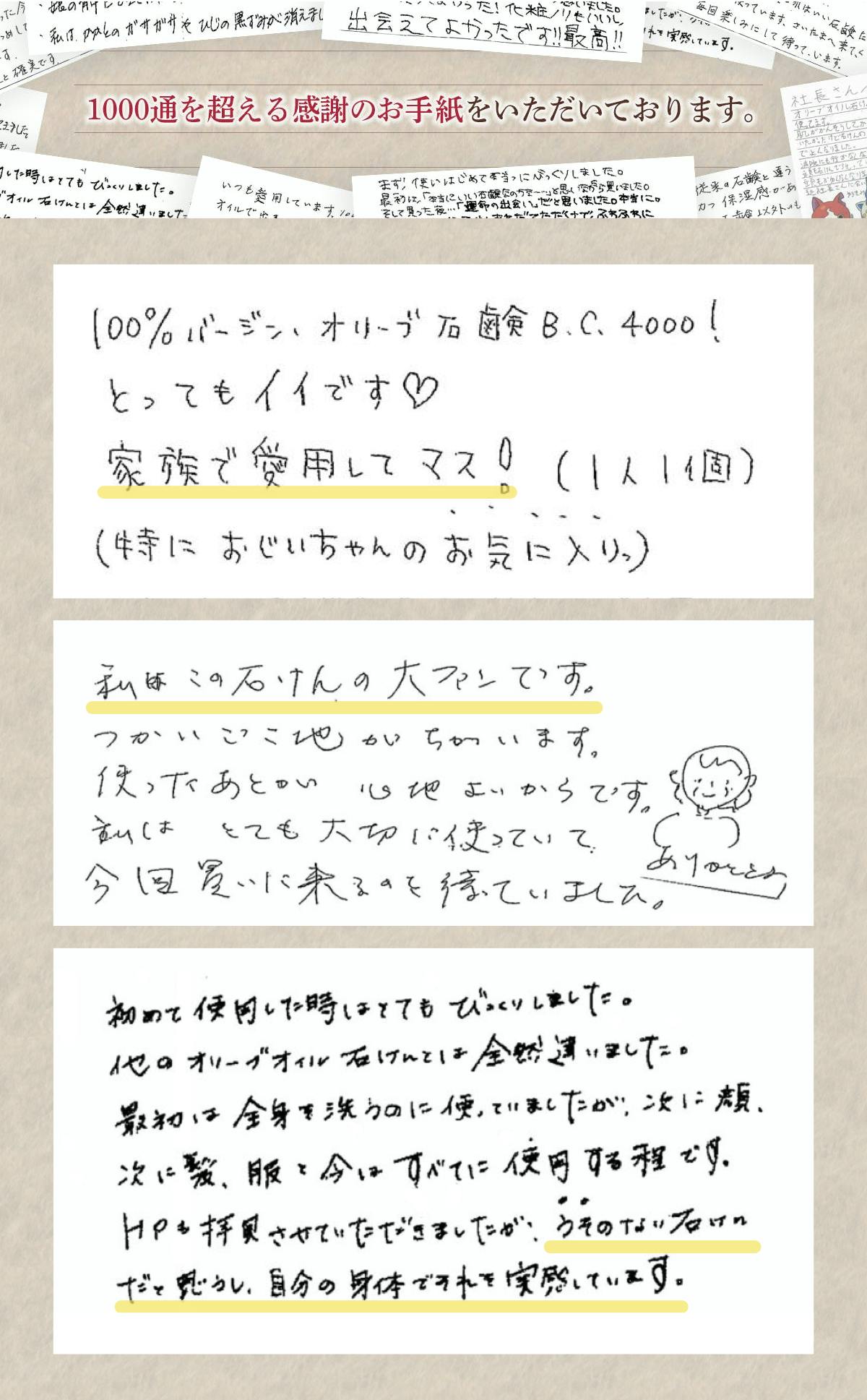 1000名を超えるお客様から「使い始めて本当にびっくりしました」「私はこの石鹸の大ファンです!」「今では家族8人全員で愛用しています」など本当に嬉しいお手紙をいただくほど好評いただいております。