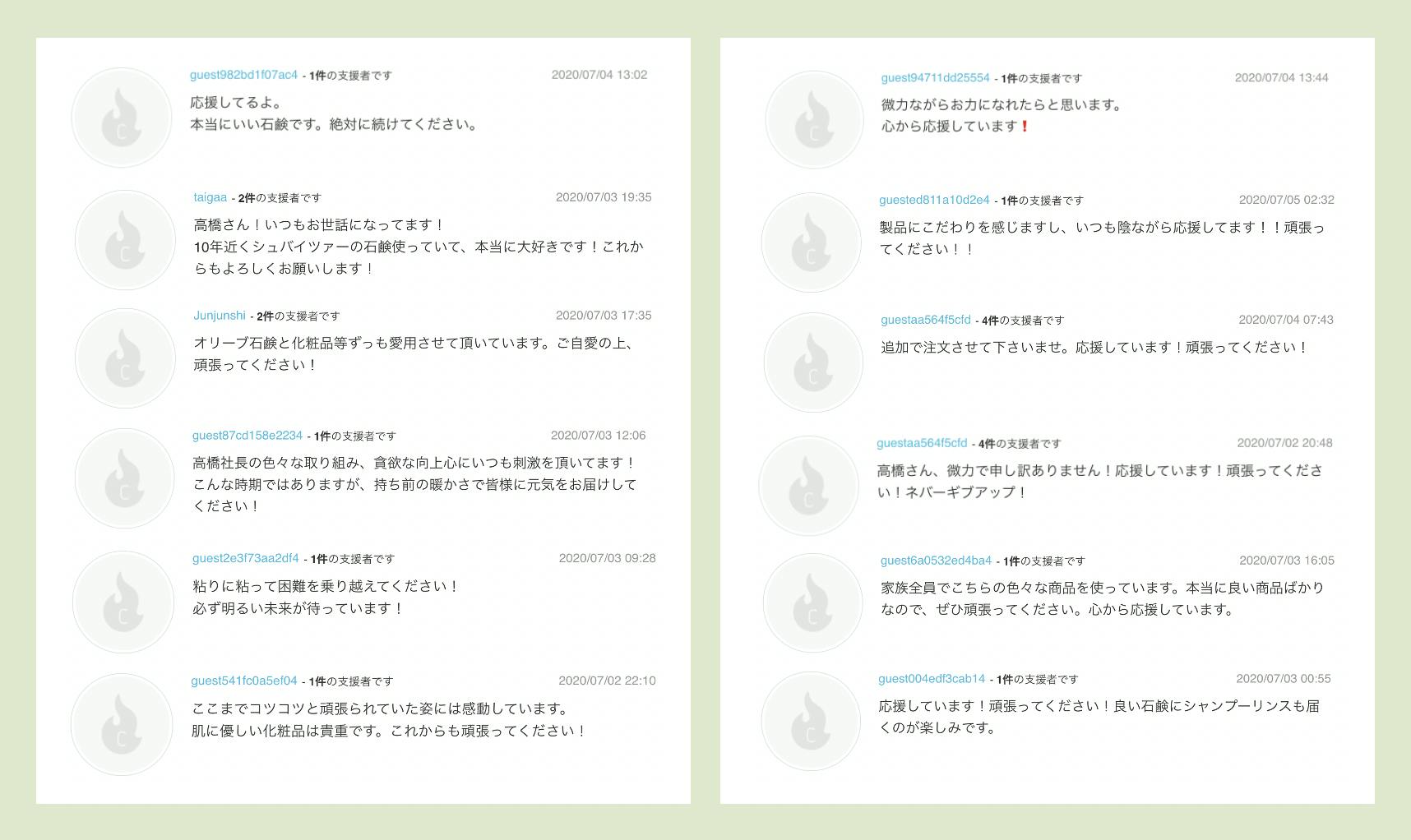 クラウドファウンディングを実施することを一部お客様にもお伝えしたところ、応援メッセージをいただきました。そちらも合わせて掲載させていただきます。