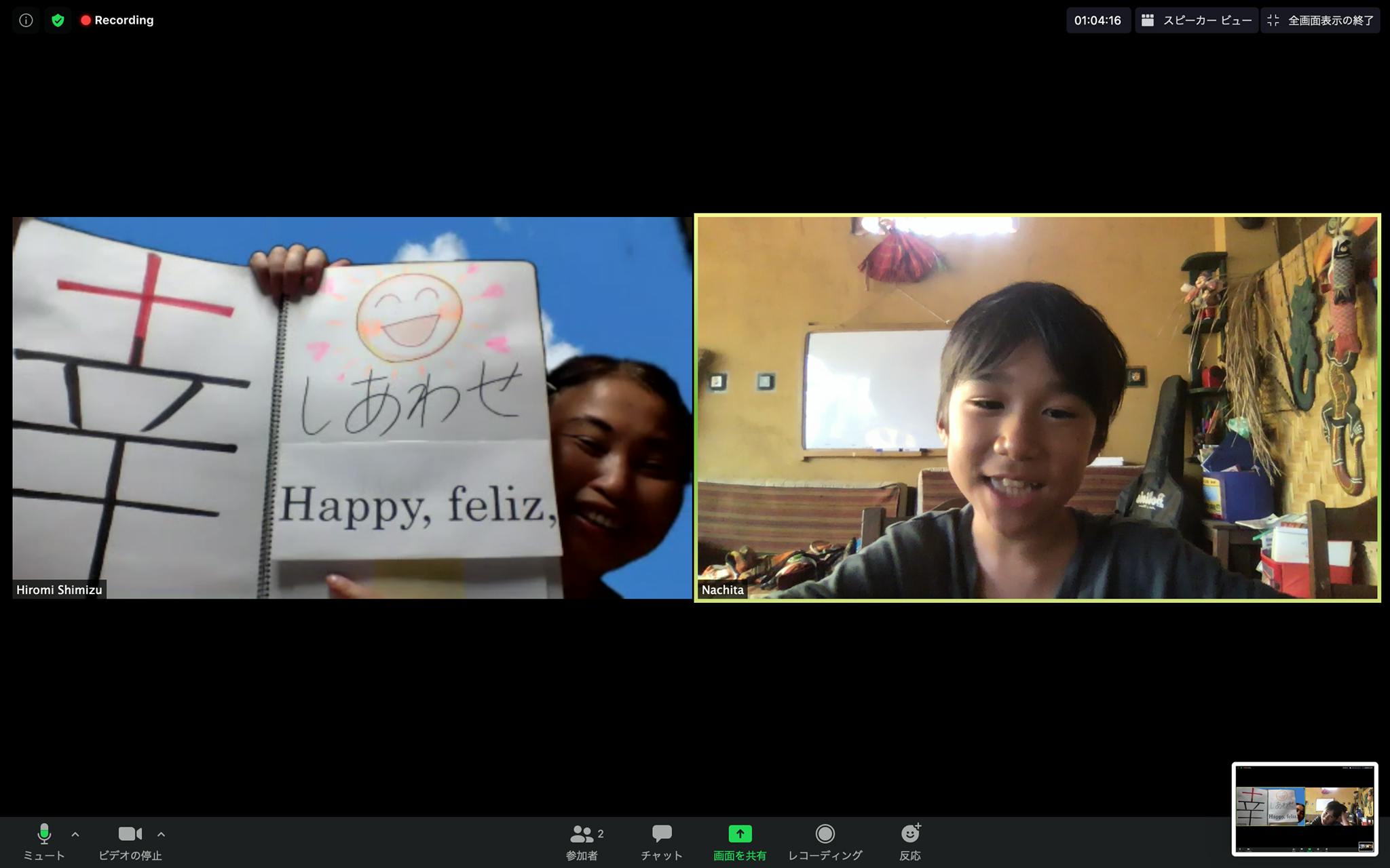 「宿題やった?」「やったー」。ズームを使ったオンライン学習支援で、在宅待機中の日本語教師と話す子どもたち