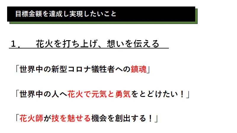 今現在も外出や経済活動が制限される中、各種興行中止に伴い、花火師が想いを込めて創った花火を披露する場所や機会を失い、日本が誇る花火文化が衰退していく危機に瀕している。このような状況で、花火師の想いと技術を披露する機会を創出する為、打ち上げられなくなった花火玉を花火業者から買い取り、花火競技大会を開催したい。