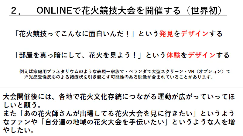 感染拡大防止の観点から花火の打ち上げは無観客で行った上で、インターネットを通じて映像を配信し、自宅等で楽しめるエンターテイメントとして観覧いただく。なおインターネットによる花火競技は世界初の試みであり、新たな発見・花火の魅力や楽しみ方を提案したい。