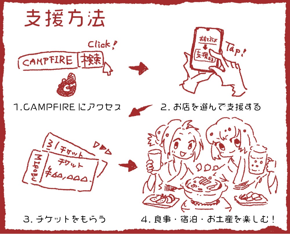 お客様が登録店リストから支援したいお店を選び、下記支援コースから各店の利用チケットをお選びいただき購入してください。チケットには2割のプレミアムがついています。