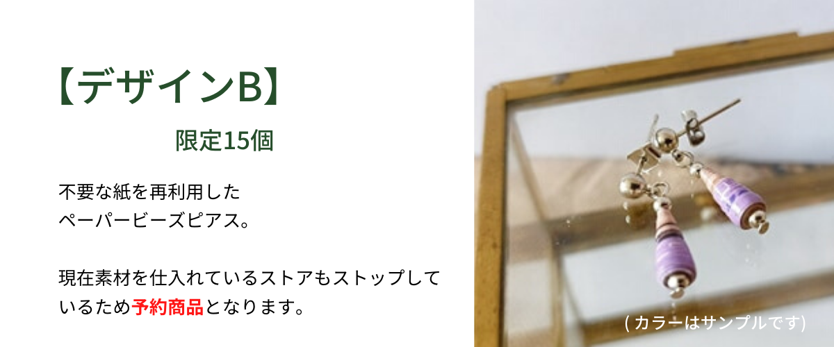販売を始めたペーパービーズピアス(不要な紙を使用したアクセサリー)の話をACTION代表の横田さんにお話しをさせていただいたところ、ACTIONでもプロジェクトとしてお母さんたちのアクセサリー作りを行っているということを伺い、実際に見学をさせていただき今年の2月より販売のスタートをいたしました。