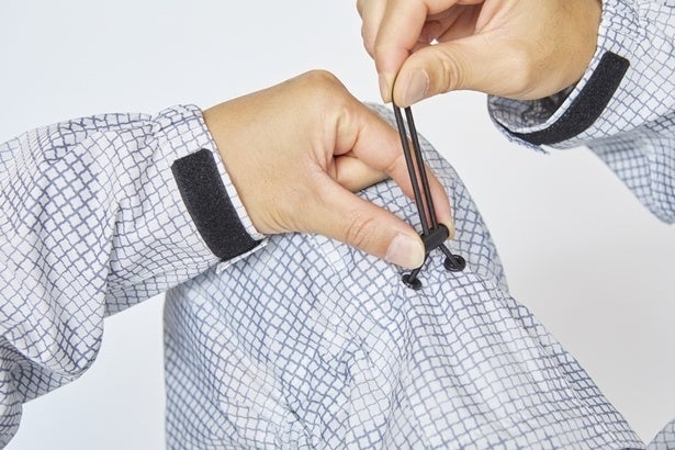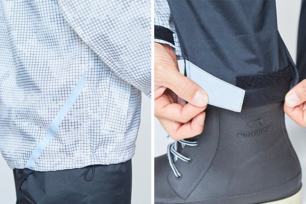 袖はベルクロによって、雨や冷気の侵入を防ぐことができます。また裾もドローコードによってずり上がりにくくすることができます。