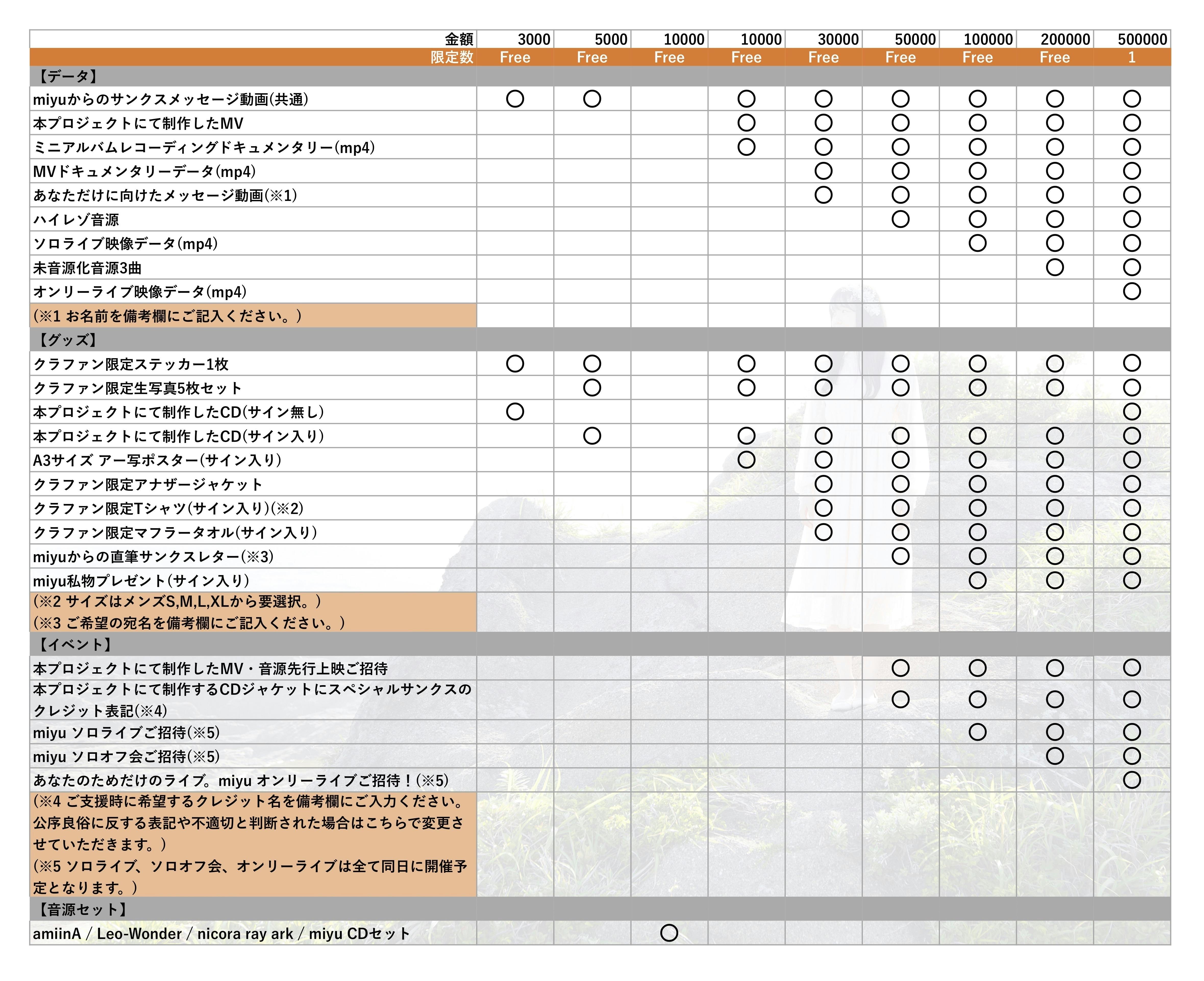 あなたのためだけにmiyuがライブをします。miyu ソロライブ、miyu ソロオフ会と同日の開催になります(都内開催予定)。新型コロナウイルスの影響によりスケジュールに関しましては調整中です。開催日時につきましては、ご支援者様とご相談させていただきますが、万が一ご支援者様の都合により参加いただけない場合の振替対応等は致しませんのでご了承ください。