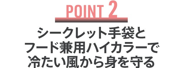 またハイカラーは引き延ばすと頭や耳をすっぽり覆うフードに早変わり。冬のスポーツ観戦や、限定グッズの行列でもあなたの体を外の寒さから機能的に守ります。