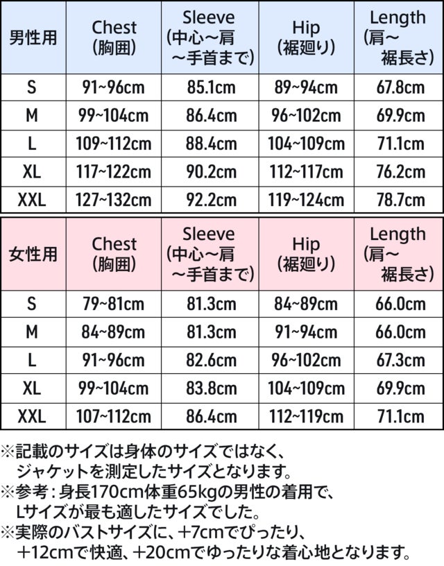 また、身長170cm体重65kgの中肉男性の場合Lサイズが最も快適に、175cmのスリムな男性でもLサイズがぴったりで、身長170cm体重55kgの男性はMサイズでぴったりでした。バストサイズを参考に、冬場の着用を想定して少し余裕を持ったサイズ選びをおすすめいたします。