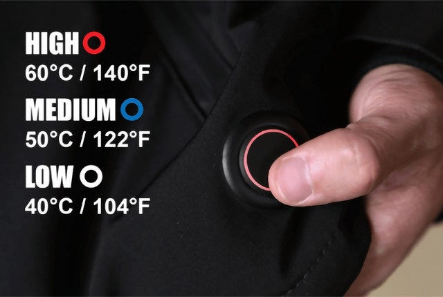 温度調節ボタンは表(ブラック)の左フロントポケット下にあります。
