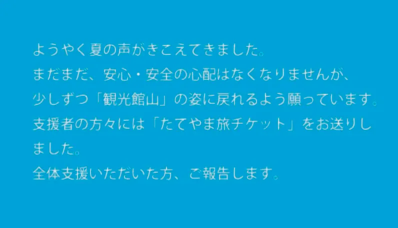 同じような思いで、今を苦しんでいる仲間がいます。そこで、ファンの皆さまに、旅好きなあなたに、館山を愛するあなたに、元気に旅する気持ちになったそのときのために、未来の「館山の旅」を予約していただこう、とプロジェクトを立ち上げました。