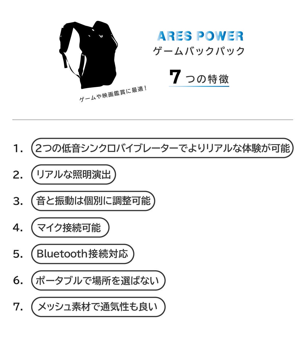 ARES POWERの「ゲームバックパック」と「ゲームシートクッション」は、搭載された低音シンクロバイブレータにより、臨場感のあるサウンド体験に必要な「振動」をリアルに味わうことができる製品になります。