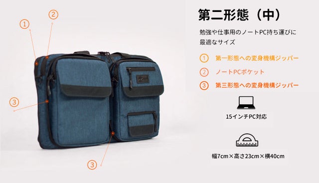 丈夫なジッパーで簡単に第一形態(大)から第二形態(中)に変身!