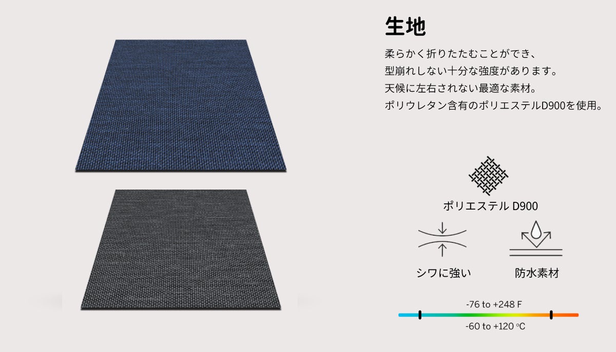 生地は、防水でシワになりにくいポリエステルD900を使用しています。柔らかく折り畳みやすいのに、しっかり丈夫な素材です。