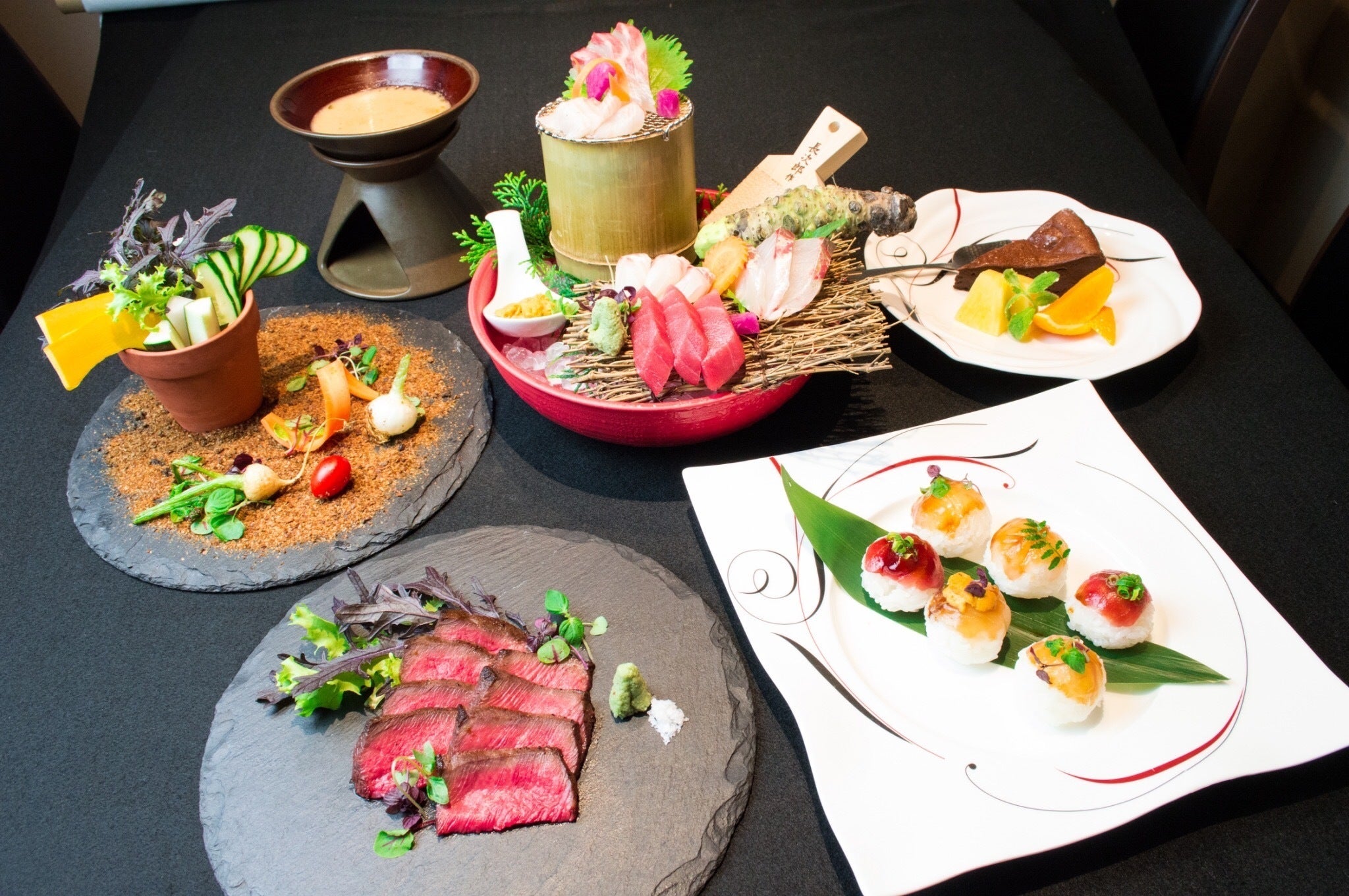 お肉をメインに四季折々の新鮮な魚や野菜をふんだんに使用。人気のコースは【彩・凜・華】の三種類あり内容が毎月変わります。店内はカウンター・テーブル個室があり落ち着いた空間となっております。器はオーナーと料理長が選び抜いた有田焼の数々を使用しており料理だけではなく器を含めた総合芸術をご堪能ください。女子会・デート・記念日・接待など普段使い〜特別な日など様々なシーンでご利用頂けます。