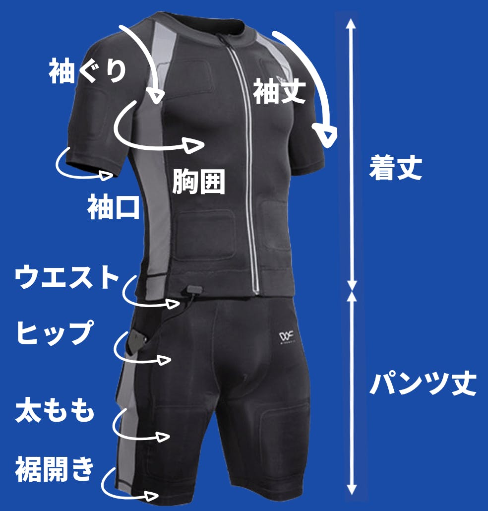 EMSスーツ男性用は上半身に8つ、下半身に6つ合計14個のパッドを搭載(腕、胸、腹部、背中、太もも、お尻、裏もも 各2つ)