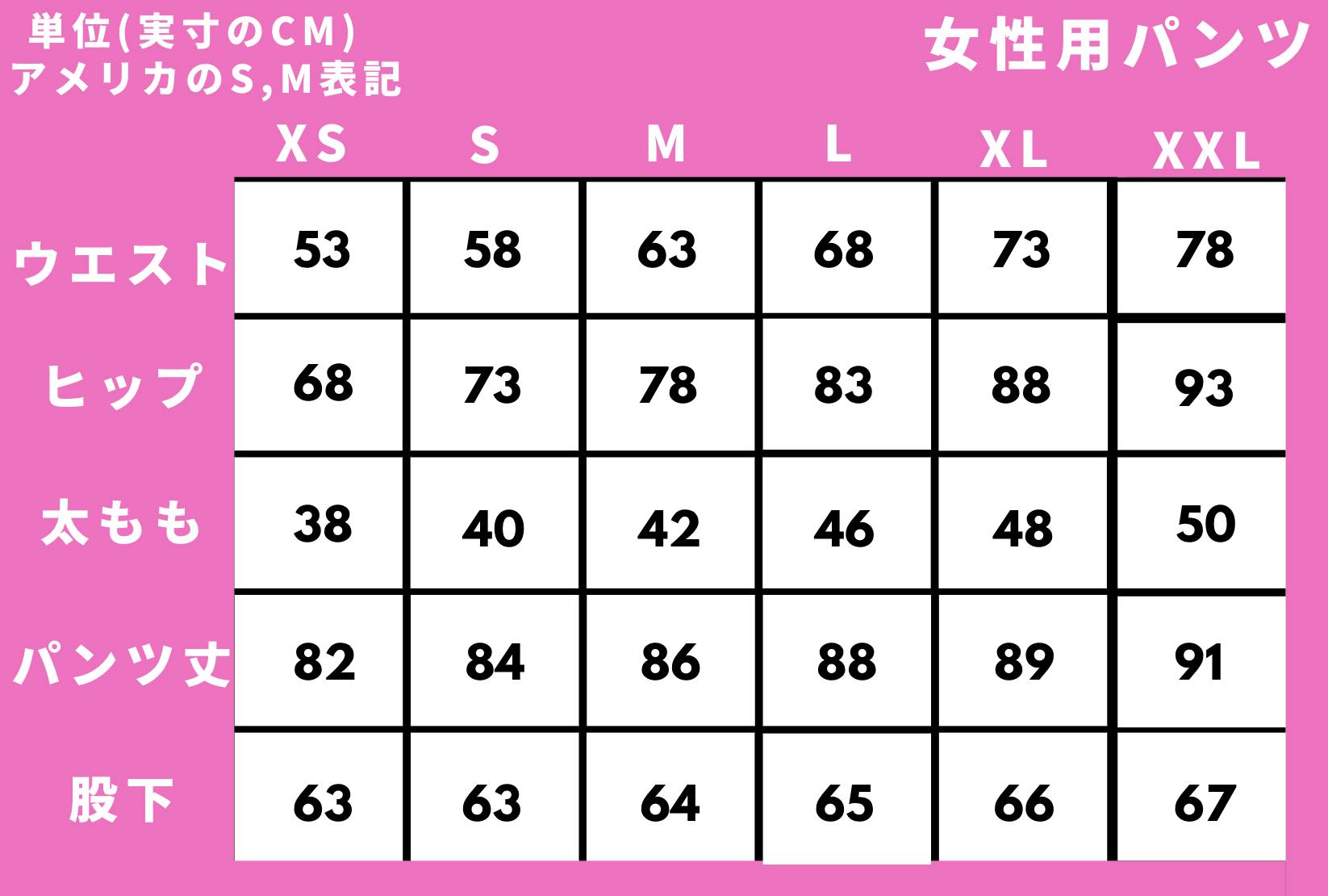 ※サイズ表は実寸(平置きの寸法×2)で表示しています。全方向に5cm以上伸縮する素材を使用しています。サイズはアメリカのS,M表記になっています。