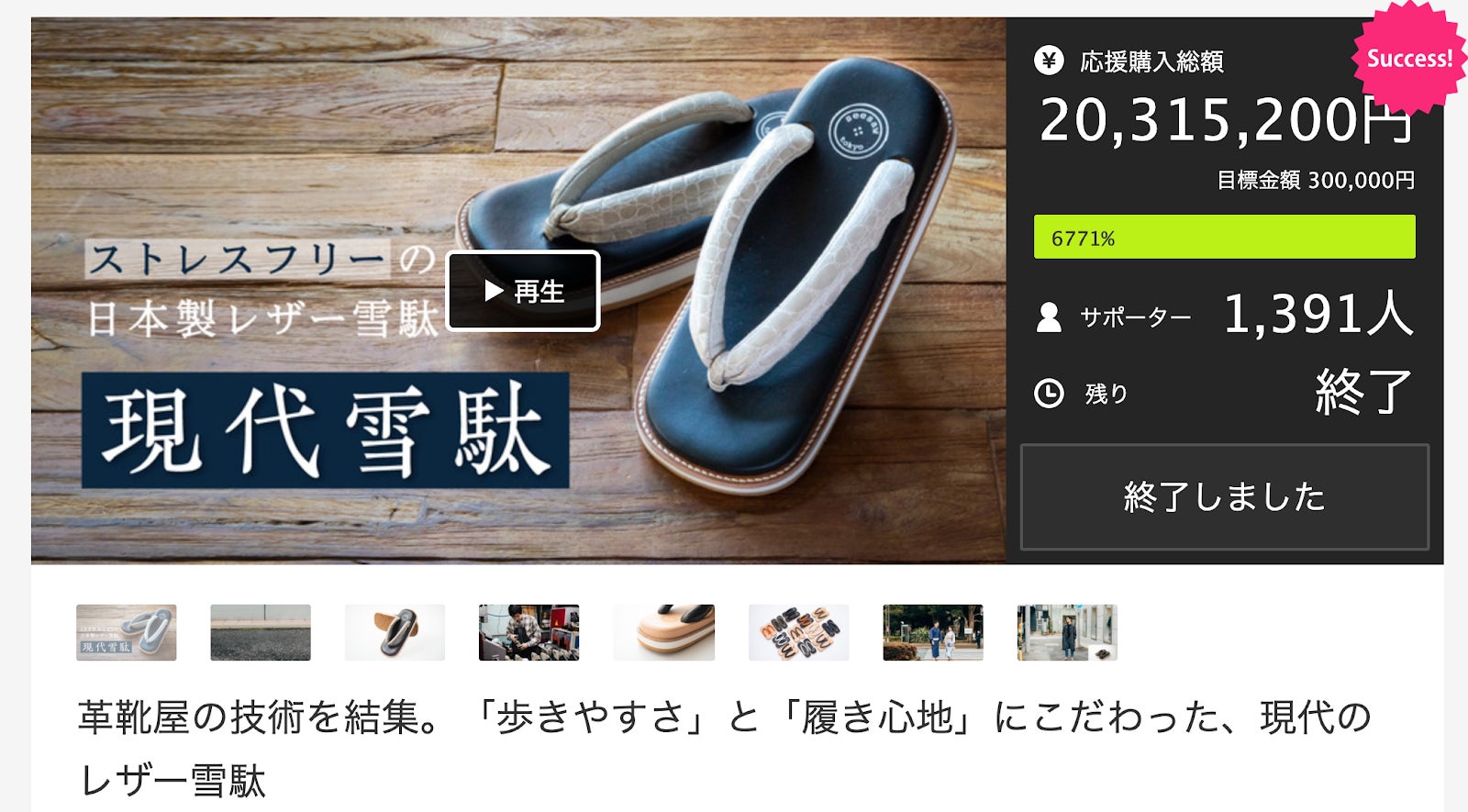 2020/07/28 12:18株式会社リフトでございます。「ストレスフリーの日本製レザー雪駄サンダル。まさに現代の履き物。」支援金額1,277,000円、支援者105人もの皆様にご支援いただき終了致しました!沢山のご支援賜り、誠にありがとうございます。これより材料の手配から生産を開始いたします。商品のお届けまで今しばらくお待ちください。生産の過程なども皆様に活動報告できればと思っております。今後とも宜しくお願い致します。株式会社リフト もっと見る