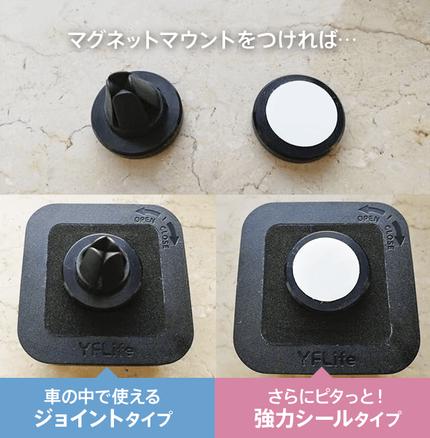 マグネットマウントは車の送風部分にジョイントするタイプとシールで貼り付けるタイプの2種類が付属。
