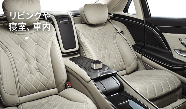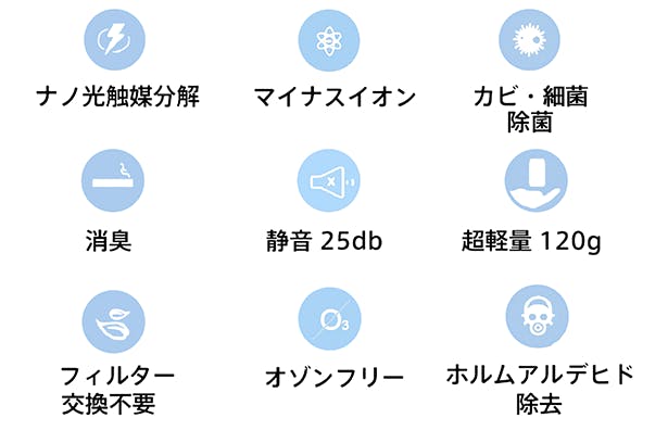 A:室内のみならず、キャンプ場や公園等屋外でも、本体とモバイルバッテリーをUSBケーブルでつなぎ、電源を供給していただけますとご使用できます。また、本商品はナノ光触媒技術のみならず、マイナスイオンのダブルパワーを搭載しています。本体を通過した空気がナノ光触媒技術で浄化されるとともに、毎秒2,000万個発生するマイナスイオンが空中の浮遊物質も浄化していきます。