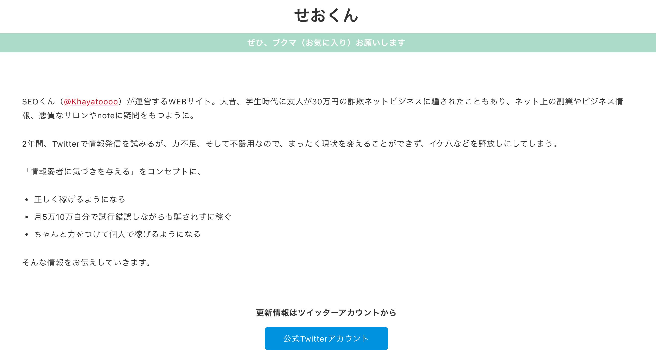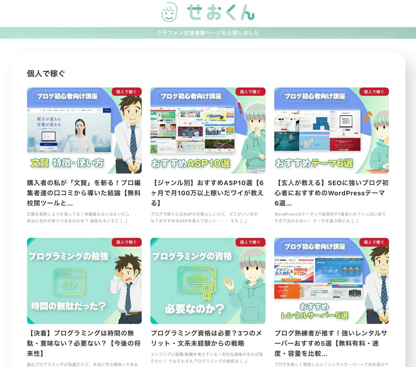 2020/08/02 14:57今回のクラファンで立ち上げたサイト(https://chant-kasegu.com/)は、運営者である、せおくんが掲げるビジョン「個人で正しくビジネスを取り組めるようになる情報をWEB媒体で提供する」その理念に共感してくださった、多くの支援者さまのおかげで制作が進んでいます。このページで紹介致しますのは、5万円の枠でご支援してくださった方々です。あまり表沙汰にしてなかったのですが、なんと、13名もの方々にご支援いただきました。※1名の方はサービス構築中のため、ひとまずは取り下げとのことでご依頼うけております。その節は、本当にありがとうございました...!私から支援者さまのサイトを、拙いながらもご紹介させて頂きます。ふるさと納税ガイド 編集部68万件を超える謝礼品を掲載。国内最大規模のふるさと納税情報サイト。その実績を評価され、大手ASPであるアクセストレードのインタビューでも掲載されております。成功したアフィリエイトサイトから学ぼう<ふるさと納税ガイド>ふるさと納税ガイドは、collegues(カリーグズ)という会社が運営しています。collegues=同僚(仲間)という意味とのことです。社名に付けられた想いをエンジンに、仲間と共に夢を追いかけ、最高のWEBサイトを作り上げていることが伝わってきます。「ふるさと納税ガイド」と検索!石川隼佑さま石川さまはリスティング運用の事業をされています。WEB広告業界もボッタクリな手数料や詐欺まがいが横行しています。ITに疎いクライアントさんだと、どうしても相場を遥かに越えるフィーを、悪しき広告代理店に払っているのが現状。そうしたクライアントさんを救い出すことを主として活動されています。お値段プランも良心的に思いますので、ご興味の湧いた方はぜひチェックしてみてくださいね。「listing ads」と検索!岡本恵典さま「就活の教科書」は、産経新聞にも取り上げられるほど、作り込まれたWEBサイト。「就活生に寄り添った情報を届ける」をミッションに掲げ、30名を越える現役就活生を束ね、日々コンテンツの編集に励んでいます。そのことが「運営概要」から把握できます。今後の展開にさらに注目ですね!「就活の教科書」と検索!就活の教科書チャンネル(YouTube)デン子さま観光にも地元の方にも便利な札幌市電沿線ガイド。札幌市電(路面電車)における停留所、周辺施設情報が、これでもかというほどに網羅されています。地元民も知らないようなコアな情報まで掲載されています。周辺情報について、例えば以下のようなジャンルに絞って検索出来るので便利。グルメスイーツショップ銭湯札幌観光に行く際にはぜひ活用したい、ご当地愛に溢れた頼りになるサイトです!「シデンエンセン!札幌市電沿線ガイド」と検索!辻尚也さま就活生にとっても分かりやすいように、企業を分析する。珍しい切り口のサービス。無知な学生にとって、卒業後の本質的なキャリアを考えるうえで、志望する会社が何をしていてどれくらい数字をあげているのかその情報を客観的に知ることは大事ですよね。未上場ふくめた大半の会社を網羅した大規模なサイトになってくると、かなり面白そうです。就活生の方はぜひチェックしてみてください。「イロミル 企業分析」と検索!ボルゾイさま運営者「ボルゾイさま」のキャリアは、日系証券会社→M&Aブティックファーム。その経験を糧に、M&A業界に特化した転職情報を指南するブログサイトです。東京でゴリゴリお仕事されているのが伝わってくるTwitterも運営されており、そのワーカホリックな姿勢に、私も日々感化されています。「ボルゾイ 転職ブログ」 で検索!岡本翔さま虐待問題を解決するスタートアップ企業。創業後2年半ほど新卒領域で事業を展開し、売却。その後、虐待問題と向き合うことを決意した若手起業家である岡本さまからご支援いただきました。岡本さまは20代前半とのことです。虐待問題という難しい領域に果敢に挑戦している若者が日本にいて、はたまた、ご支援まで頂き、私も頑張ろう!という気持ちになります。岡本翔さまのTwitterアラートさん さま1社300円でご希望の企業を調査できます。転職先・取引先がどういう会社かを公開情報から調べて率直な判断いただけるサービスです。大手メディアにも沢山取り上げられている、知る人ぞ知る「アラートさん」が運営しています。ブラック企業アラートアラートさんTwitterまるのすけ さまお得なマイル情報をはじめ、旅行に関する情報をまとめたWEBサイト。事細かにマイルなどのお得情報がブログにて記されています。アメックスカードの紹介キャンペーンも限定で公開されています。まるのすけ様のサイト経由でアメックスに登録するとお得に入会できます。情報量が豊富で、キレイにまとまっている素敵なサイトです。2020年5月のアップデートにおいて、個人サイトが厳しくなってきている現状ではありますが、どこかで復活、あるいは合間を縫って一緒に挽回できればと思います。「マイル研究所」で検索
