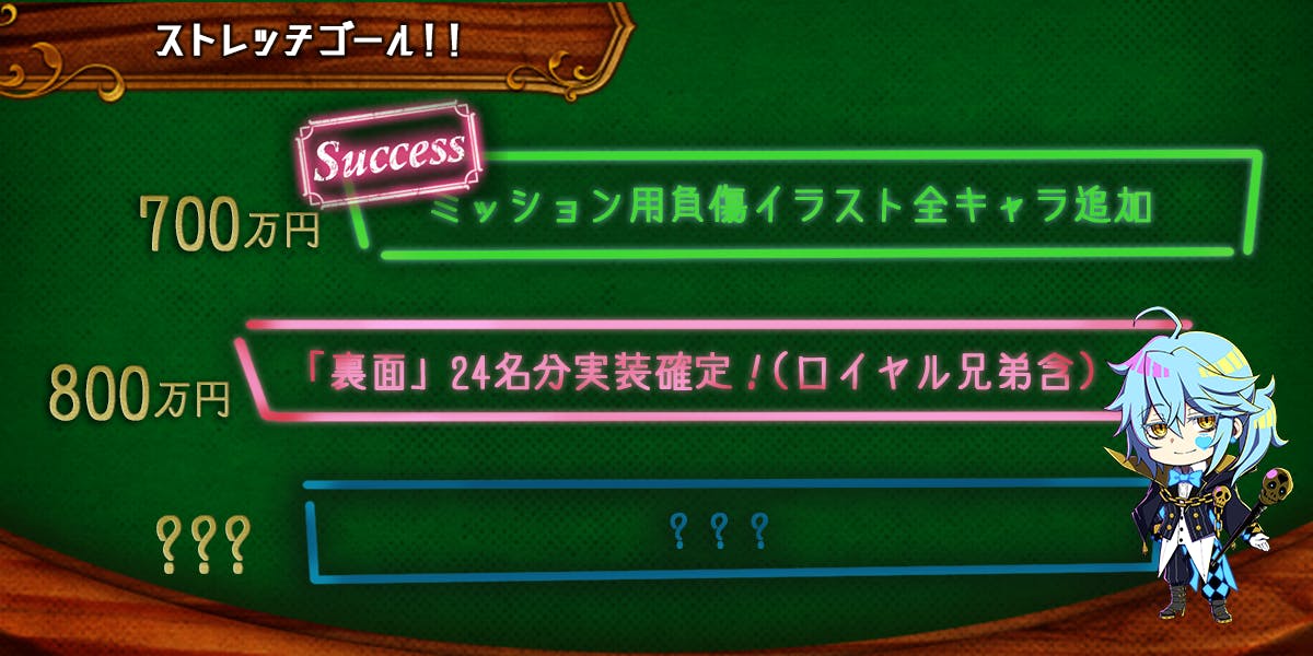 「700万円」では、ゲーム内の「ミッション」でキャラクターが負傷したときのイラストを追加いたします。これにより、各キャラクターの新たな一面をお伝えすることができます。(目標達成!)
