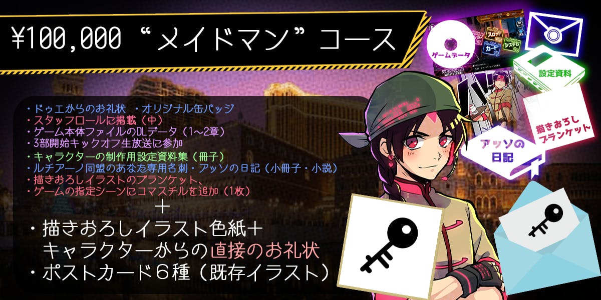本プロジェクトでは、現バージョンのゲームDLデータに加えて設定資料集や専用名刺、本編に新規イラストを追加する権利など、2章までの物語を楽しんでくださった方、本作の世界観やキャラクターに興味を持っていただけた方にご満足いただける返礼品を多数取りそろえています。