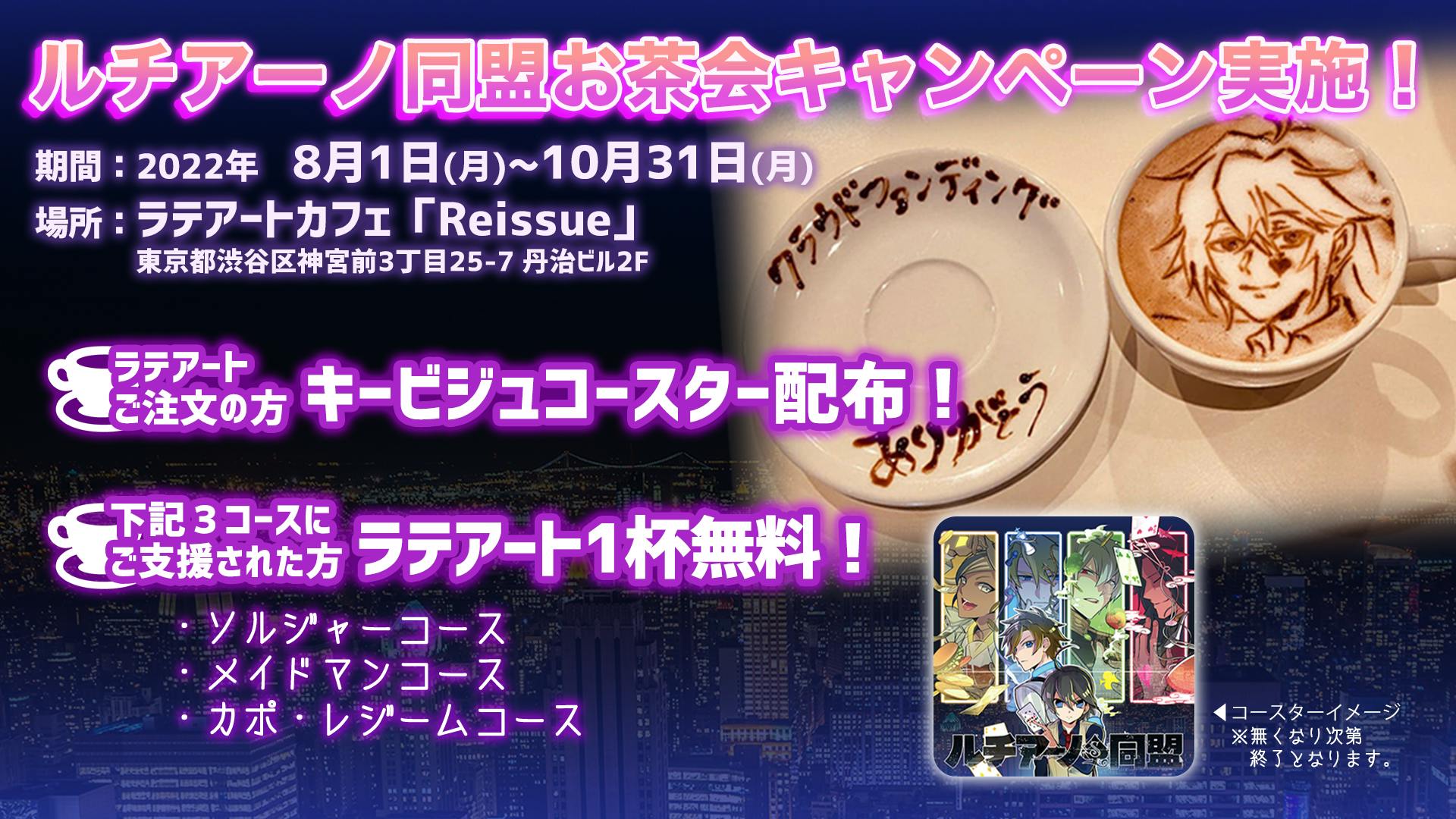2022/08/01 18:31お世話になっております。ルチアーノ同盟制作スタッフです。打ち上げの中止と、代わりのお茶会キャンペーン実施の連絡をいたします。10万円以上のコースの返礼品にご用意しておりました打ち上げについて、新型感染症の蔓延状況を鑑み、開催を断念することといたしました。楽しみにしてくださった方々には誠に申し訳ございません。そこで打ち上げの代わりに、原宿のラテアートカフェ「リシュー」様にてお茶会キャンペーンを実施いたします。下記概要になります。──────────────────────■お茶会キャンペーン概要期間中、ラテアートカフェ「Reissue」様にてラテアートをご注文された方に特典がございます。●ご注文された方:・ラテアートご注文の際、ルチアーノ同盟のキービジュアルコースターが1枚付いてきます。※注文されたラテアートと同じ数のコースターを配布いたします。●10万円以上のコースにご支援いただいた方:「ソルジャーコース」「メイドマンコース」「カポ・レジームコース」にご支援いただいた方が対象です。・ラテアートを1杯無料でご注文いただけます。 ・ラテアートご注文の際、ルチアーノ同盟のキービジュアルコースターが1枚付いてきます。※上記3コースに複数回ご支援いただいた方は、支援回数分のラテアートを無料でご注文いただけます。■期間2022年8月1日~2022年10月31日■場所ラテアートカフェ「Reissue」(リシュー)〒150-0001東京都渋谷区神宮前3丁目25-7 丹治ビル2F営業時間につきましては、ラテアートカフェ「Reissue」様の各種公式サイト・公式アカウントをご参照ください。▼HPhttps://www.reissue.co.jp▼Twitterhttps://twitter.com/Cafe_Reissue■参加方法①期間中、各自でラテアートカフェ「Reissue」様にご来店ください。②ラテアートの内容はリクエスト可能です。描いてほしいキャラクターをスマートフォンの画面などにご準備の上、ラテアートをご注文ください。③ご注文の際、「ルチアーノ同盟のお茶会キャンペーンです」と店員にお知らせください。10万円以上のコースで支援された方は、・「ルチアーノ同盟クラファン参加者です」とお知らせください。・お店の方に支援画面(※)をお見せください。・支援IDまたは支援者名をお伝えください。(※)支援画面の表示方法について①CAMPFIREのサイトにログイン。②CAMPFIREのユーザーアイコンをタップ。③「支援したプロジェクト」を選択。④「ゲーム『ルチアーノ同盟』を大規模リニューアルし、新章を作りたい!」の詳細を表示。以上の操作で支援画面を表示することができます。──────────────────────概要は以上になります。特典コースターには数の余裕が十分にございます。人気店で土日は混み合うため、10月末までの期間中の余裕ある時期にご来店いただけますと幸いです。感染症には十分ご注意の上、お茶会キャンペーンをお楽しみください。引き続きルチアーノ同盟をよろしくお願いいたします。※トランプは付属いたしましせん。 もっと見る【支援者向け】「クローズドβテスト」終了のお知らせ