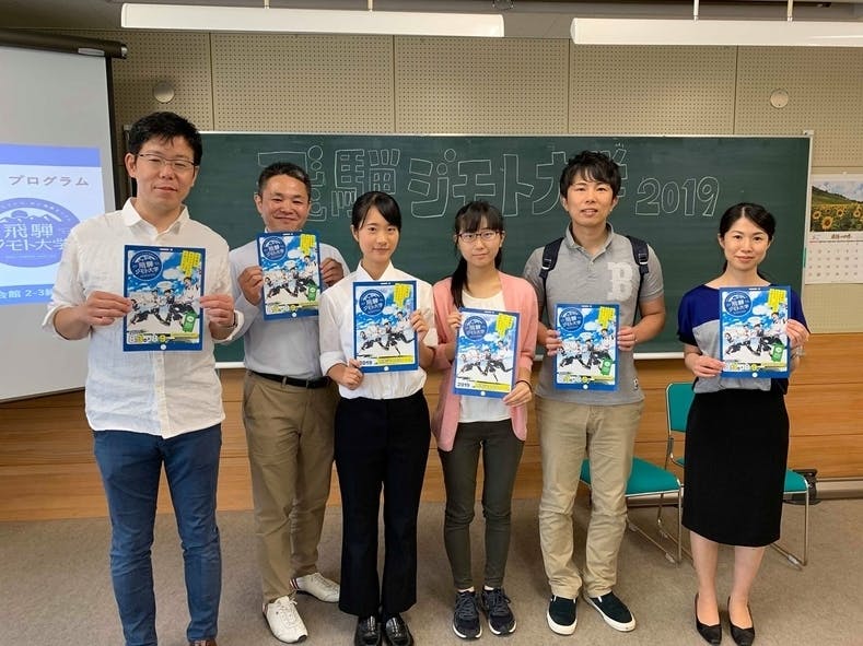 私たち「飛騨ジモト大学」は2019年3月4日に発足したばかりの市民団体です。「飛騨地方の高校生を対象に、地元のカッコいい大人たちと出会い、学べる場をつくりたい!」そんな想いに共感したひだ経営コンサルティングの丸山学さん、ゴーアヘッドワークス代表の蒲優祐さんを共同代表に、岐阜県職員の樋口克孝さん、飛騨信用組合の古里圭史さん・水川明美さんにもご協力いただき発足しました。