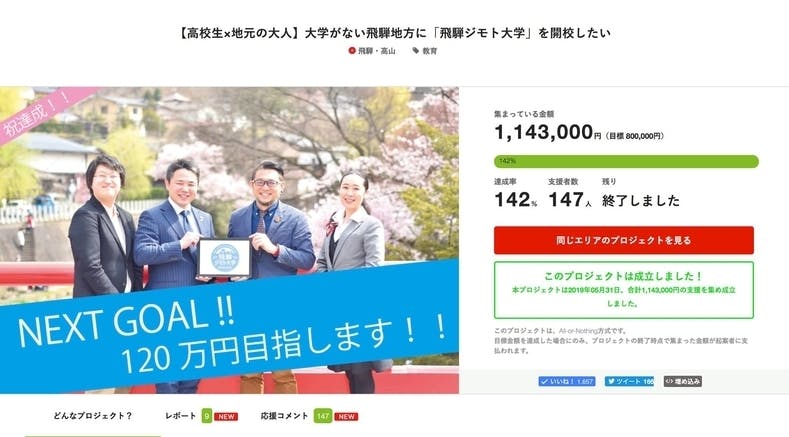 2019/06/21 18:02クラウドファンディング 達成いたしました! 皆さま、ご無沙汰しております。飛騨ジモト大学 事務局の丸山純平です。 まずもって、こちらでの御礼が遅くなってしまいましたが、先日無事にクラウドファンディング が終了し、最終的な達成率は142%、サイト外も含めたら150人以上の方からご支援をいただき成立となりました! 飛騨地方を中心に、北は福島から南は沖縄、全国各地の友人・知人、飛騨に縁ある人、想いに共感してくださった人、ご自身の故郷と重ねられた人、この春に飛騨から巣立った人・・。 10代から70代まで世代も幅広く、いろんな方のいろんな想いが乗っかったご支援金です。大切に大切に使わせていただきます!!(しっかりと会計報告もいたしますので、ご安心を・・!) リターン品の郵送物は、パンフレットが刷り上がる7月初旬から中旬にかけての発送になります。もうしばらくお待ちください! 各高校さんへご挨拶に伺っています!! わたしたちは市民団体のため、どうしても実際の高校生や教員の皆さまとは接点が薄いのが現状です。それならば、泥臭く足で稼ぐしかない!ということで、飛騨地方の7つの高校さんへ、順にご挨拶に伺っております。 先日は、飛騨市の吉城高校にて全校集会の貴重なお時間をいただいて、飛騨ジモト大学の説明や「YCKプロジェクト」との連動性などお話しさせていただきました。 とはいえ、吉城高校の教員の皆さまやキャリアコーディネーターの長瀬めぐみさんのお力添えがあってこそ・・。本当にありがたい限りです。 高校生会議を開催しました!!! 実際の高校生の生の声が聞きたい!ということで、発足記念講演会に参加してくださった斐太高校3年生のUさんにご協力いただき、「飛騨ジモト大学 高校生会議」を開催いたしました! 僕らの企画やパンフレットデザインに鋭いツッコミが・・(笑)。おかげで、かなり良い方向性へ進化していると思います!! 早く、皆さまにもお披露目したいです。今月末にはお伝えできるかも・・。 ということで、引き続き、飛騨ジモト大学は走り続けます!! 最新情報は飛騨ジモト大学Facebookページ、もしくは公式Twitterをご覧ください。 もっと見る