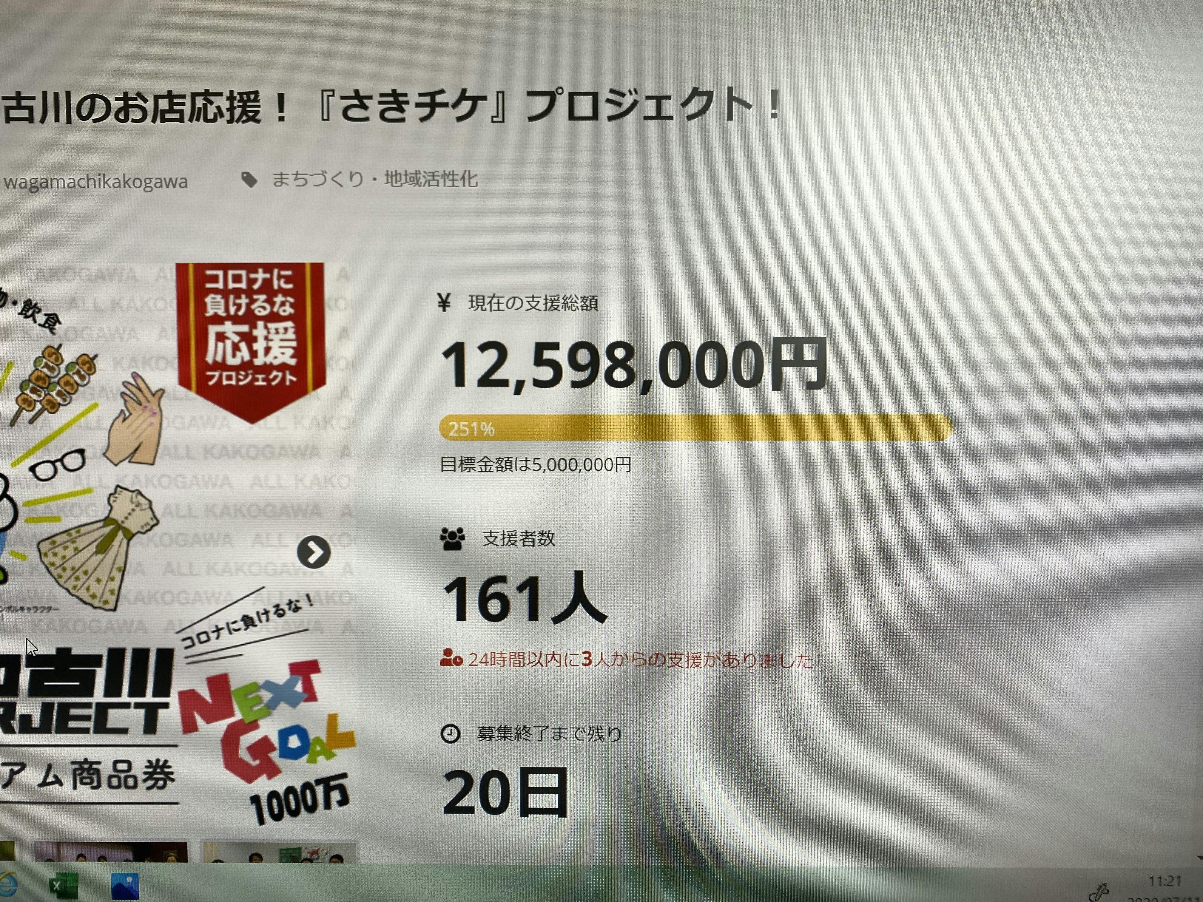 2020/07/11 11:34わがまちファンド加古川事務局です。1000万円、超えました!!たくさんのご支援ご協力を頂きありがとうございますm(_ _)m残り20日間引き続き全力で取り組んでいきます(^_^)販売終了の店舗も出てまいりましたが、追加の店舗も毎週お問い合せを頂き追加させて頂いております!またご覧頂けましたら幸いです。どうせ使うなら先に買ってお得!!利用期限は1年!ご友人や職場の先輩後輩、よく行くお店の方へぜひご紹介くださいm(_ _)mそしてこのプロジェクトをFacebook、インスタ、ツイッター等のSNSで情報発信して頂ければ幸いですm(_ _)m 引き続きどうぞよろしくお願い致します。明るい活気ある街の未来のために第2弾『さきチケ』オール加古川プロジェクト事務局TEL&FAX: 079-455-7851Mobile: 080-4012-0794Mail: wagamachifundkakogawa@gmail.comキャンプファイヤーサイト:https://camp-fire.jp/projects/view/286345第1弾Web: https://wagamachikakogawa.wixsite.com/website もっと見る