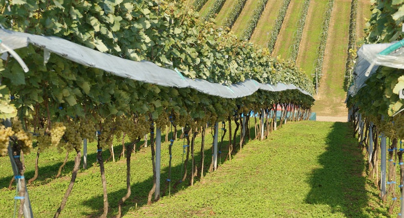 ▲ぶどうに雨が当たらないようにビニール被覆をしています。そのため、収穫時期をコントロールできぶどうの糖度を高めることが可能です。