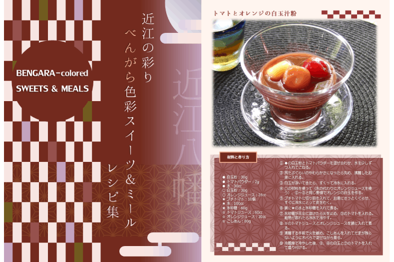 赤こんにゃく、べんがら格子、左義長祭りなど、べんがらと近江八幡との歴史文化的な関わりを紹介しながら、私たちが考えた「べんがら色彩スイーツ&ミール」のレシピをまとめた冊子を、旧吉田邸と白雲館(観光案内所)で無料配布します。