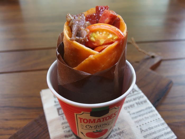 ・赤こんにゃくと近江牛と朝恋トマトのべんがらトルティーヤ巻