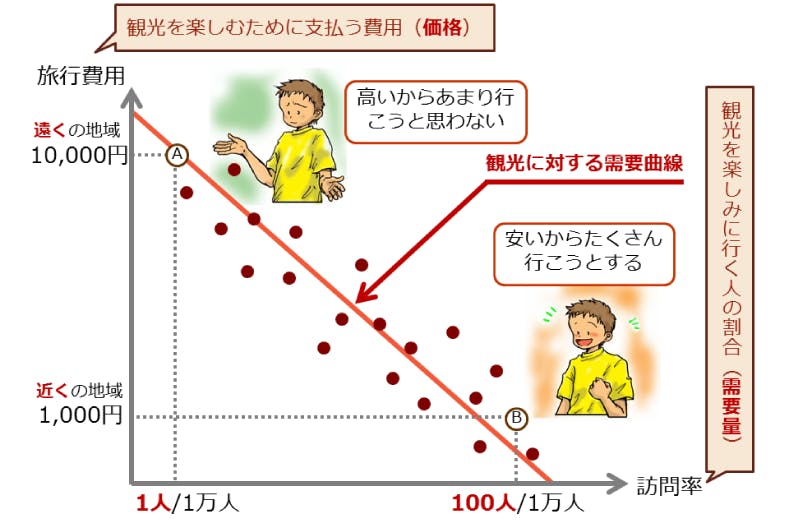 価格が高ければ買う人が少なくなり、低ければ多くなるのと同様に、旅行費用が高いと訪問する人が少なくなり、それが低いと多くの人が訪れることになるわけです。