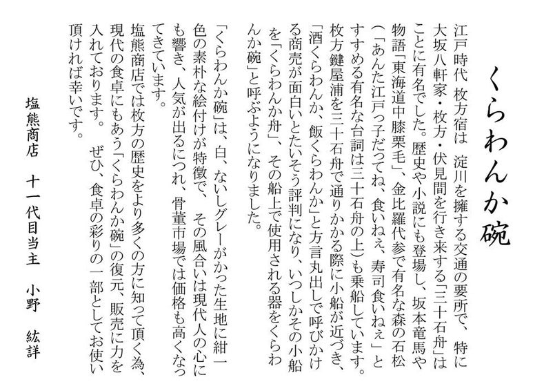 享保年間から続く老舗、塩熊の蔵に所蔵されていた「くらわんか碗」を再現。江戸時代の枚方の面影がよみがえります。贈答にも喜ばれる桐箱入り。