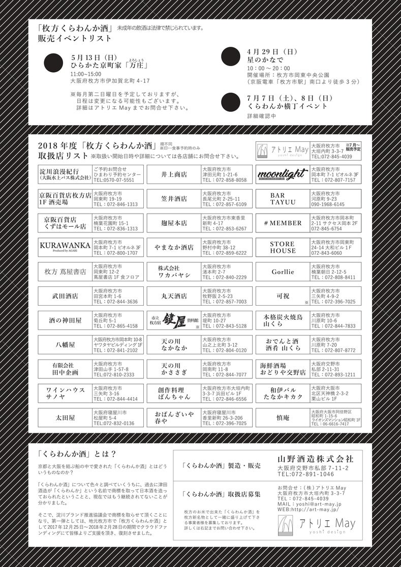 今回はクラウドファンティングで、枚方市さんと山野酒造さんにご協力頂いて<枚方 くらわんか酒>に挑戦したもので、沢山の方々にご支援頂くためにも、まずはこちらのサイトのみでのお取り扱いとさせて頂きます。