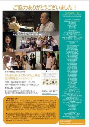 2017/09/29 11:33パトロンのみなさま、ご支援、ご協力くださったすべてのみなさま この度は「震災後の熊本のお母さん400人を笑顔にするプロジェ クト」へのご支援を本当にありがとうございました。 おかげさまで「かみさまとのやくそく」プレミアム上映会・池川明先生トークイベントは9月18日、 無事に終了いたしました。イベント直前に台風が発生し、イベントへの影響も心配されましたが、当日は台風一過の青空の下250名を超える皆さまをお迎えし、たくさんの美しい笑顔の花が咲き誇りましたことをご報告させていただきます。 このイベントでお伝えしたたくさんの愛が熊本の明日へのエネルギーとなることを願っています。微力ではありますが、また私もその一助となれるような活動を続けていきたいと思います。 今回私の師匠である心屋仁之助さんの講演会でお預かりした37,584円を含め55,555円を熊本地震義援金、熊本市熊本地震義援金として寄付いたしましたことをご報告いたします。 改めまして、この度は熊本へお気持ちを寄せていただき、想っていただき、愛を届けてくださり、本当にありがとうございました。 皆さまのプロジェクトへのご支援に深く感謝申し上げます。 機会がありましたら、美しい大地とあたたかな愛に包まれた私の大好きな故郷熊本に遊びにいらしてください。 末筆となりましたが、皆さまの今後益々のご健勝とご活躍をお祈り申し上げます。 愛と感謝を込めて。 「かみさまとのやくそく」プレミアム上映会・池川明先生トークイ ベント主催 佐々木磨美子 mail:mmkhnd1125@gmail.com blog:http://ameblo.jp/mamitani usu/ もっと見る