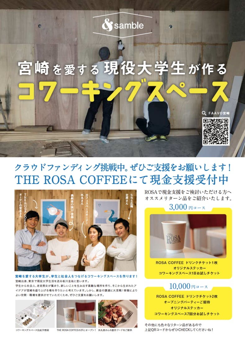 2017/11/14 15:25みなさん、こんにちは。今回は、なぜ私がこのプロジェクトを始めたのかご紹介したいと思います。 まずは、なぜ私が大学在学中にコワーキングスペースを宮崎県に作ろうと思ったのか。私は宮崎の第一高校に在学中の時に、考えた夢は宮崎の活性化をしたいと思っていました。しかし、何をしたら良いのかも分からず、宮崎に残りたい気持ちを抑えて新しい考えを探すために東京に来ました。(東京に行けば何か変わるのかなという気持ちでした) この写真は、高校の卒業式です!右は母で真ん中は恩師の田中先生です。 大学1年生の初めに、とある外資系の企業で働くことになり、そこで大きく考えが変わりました。周りの方々の、素晴らしい考え方を吸収したりして、自分でも何かしてみようと思い出しました。大学2年生の時は、イベントに顔を出すようになり、様々な人々に出会い、またその方々に紹介してもらいたくさんの刺激をもらいました。宮崎では、こんなに刺激を貰うのは難しかったのかなと思います。今は大学三年生で、就職のことを考える時期になりました。東京で様々企業や著名人の方々がやっているイベントなどたくさん行われており、そこに行くとこんな働き方や生き方があるんだ、と毎回素敵な刺激になります。宮崎を見て見ると、イベントが少なかったり、決まったようなイベントしかなくて、新しい刺激がないように感じます。実際は、イベントもたくさんあったり素敵なイベントもあります。しかし、いつも決まった人しか参加しなかったり、小さなコミュニティの中でしか行われてなかったりします。なんかもったいないと思いませんか? 私は、イベントや様々な人に出会ってから考え方が広がり、選択肢が増えました。 そこで、今の自分にできることを考えました。今の宮崎県は、何か大きなイベントごとをするのは、県外の人とかが多いと感じます。(もちろんそれはとても素敵な事です)でも、地元の人たちによって、新しい何かが生まれる可能性を増やしたいし、みんなのクリエイティビティを引き出して、コラボレーションを起こした方がもっと素敵じゃないですか?学生は、学生だからできることにどんどんチャレンジしてほしい。もっというと、どんどん学生は大人の人たちと絡むべきだし、気軽に絡めて相談できる場所を作りたい。もちろん、宮崎に残って欲しいけど選択肢を増やしてビックになって最終的に宮崎に戻ってくる学生も増やしたい。 そして、どんどんインターンもして欲しいなと、地元の企業を知って欲しいし、経験としても東京のベンチャーにインターンとか繋いでみたい! そんな想いを持って何ができるのか考えたら、コワーキングスペースを作る事でした。コワーキングスペースでは、色々な人が集まり、コラボレーションを生みやすいと考えています。私も運営する上で大切にしたいのは、ただの作業場所にならないようにしたいと思っています。 $sambleに来ると誰かしらと繋がれる、新しい刺激を受けられる場所と思われるようにします。 運営する上で、実際コワーキングスペースだけでは運営を続けることは難しい事がわかりました。そこで、カフェ、バーも併設して、収益はそちらを軸として運営を考えております。ただ、収益だけを考えてカフェ・バーをするのは違う気がしました。 そこで、Barもちょっと変わったお店にするように、いろいろな人が交代交代でやるBARにします。いろいろな人の話が聞けるBAR素敵じゃないですか?そこからまた新しい繋がりが生まれます。例えば、今日はアパレルの人がやるBARとかコーヒーショップの人がやるBARとかIT系のスタッフがやるBARとか・・ 自分的には、これは本当に本の1ページ目に過ぎないし、やりたいことはたくさんありますが、ぼんやりとした最終目標を追いかけるんじゃなくて、まずは目の前の課題を一つづつクリアすれば、自然と最終目標(宮崎の活性化)にたどり着くかなっとか思ったりします。色々書きましたが、シンプルに 宮崎が大好きで宮崎のために全力を尽くしたい。もっと色々なチャレンジをする人が増える宮崎にしたい。 このような想いで動き出しました。 共感いただけたらぜひシェアお願いいたします。オーナー 坂川 もっと見る