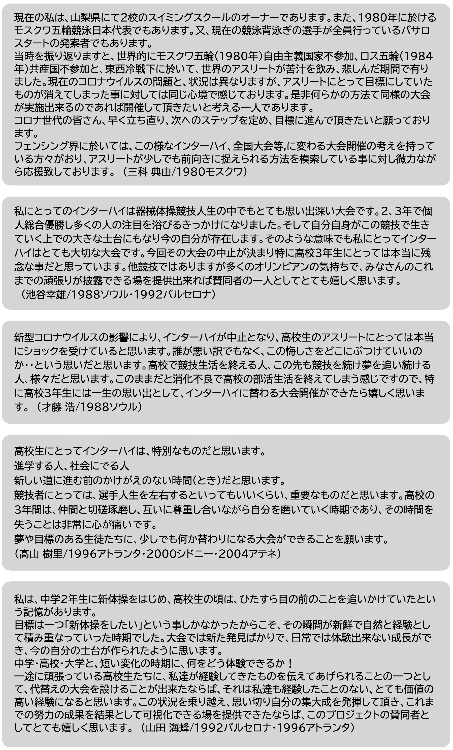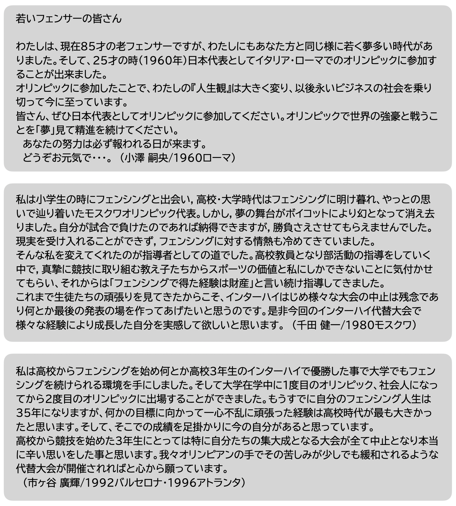 フェンシングオリンピアンからの全てのメッセージは近日中に公開する大会ウェブサイトにて公開予定です。