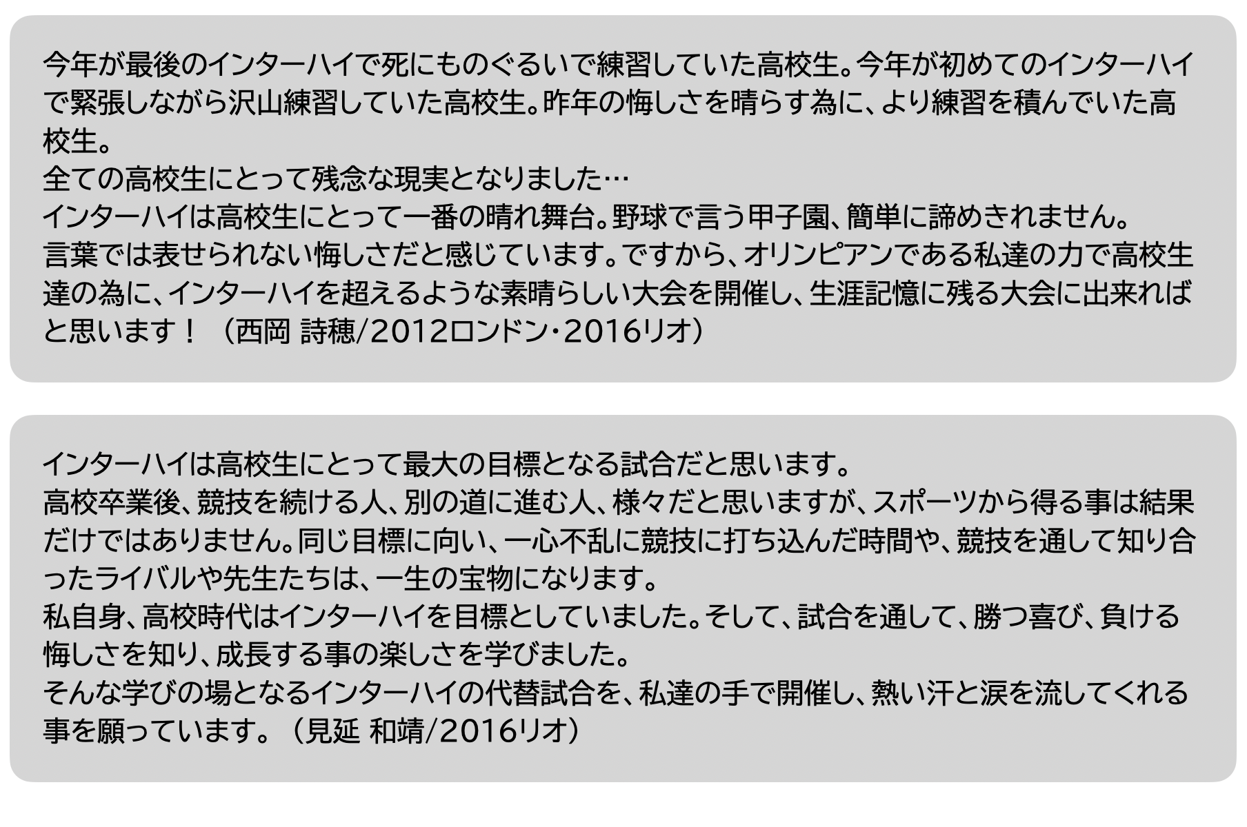 私たちのスポーツのフィールドでは、あらゆる競技会が中止になり、国内大会ではインターハイも中止となりました。青春をスポーツに捧げ、ひたむきに努力を重ねてきた高校生たちの無念を思うと、彼らにかける言葉もみつかりません。