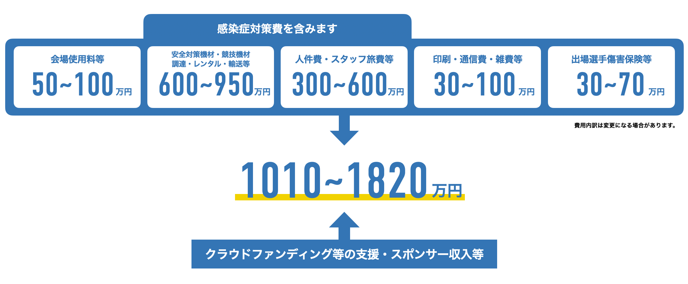 出場エントリー受付前の現時点では、開催費を確定させることは困難で、大きな幅があります。今後の感染症対策や状況の変化によって費用内訳が変わる可能性があります。