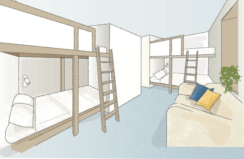 ドミトリー(二段ベッド)、キャビン(扉付きのシングルベッド)、プライベートルーム(4人まで宿泊できる個室)の3パターンからお選びいただけますので、シーンにあわせてお好きなお部屋にご宿泊ください。
