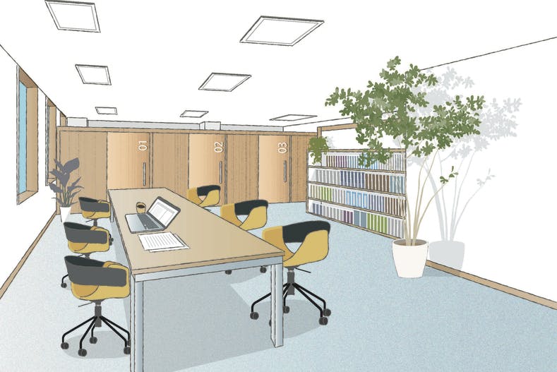 集中したいときはプライベート空間の個室(イラスト奥)、広々とした空間で仕事をしたいときは手前のオープンスペースをご利用ください。また、パーテーションもご用意しておりますので、簡単なミーティングスペースとしてもお使いいただけます。