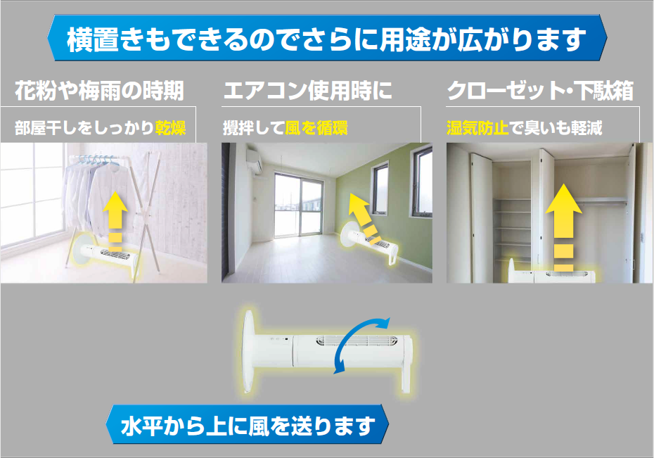 も使えるので、水平から上への風を送る事もできます。洗濯物の乾燥時やエアコンの風も