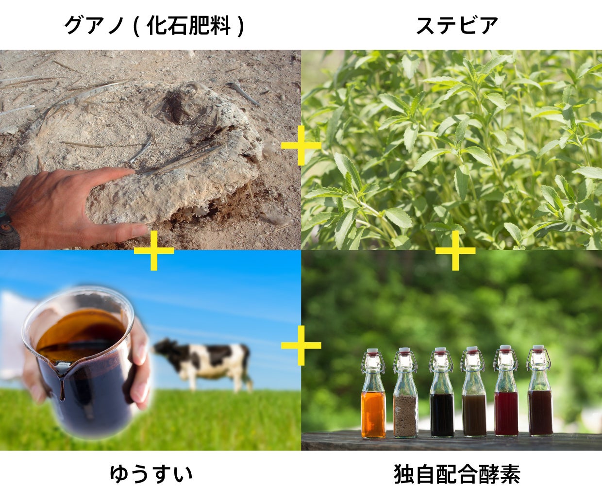 土地の肥沃化させる北海道の石山から採掘される「グアノ」と呼ばれる鳥の死骸などを化石や、サンゴ・貝の化石という空や海からの恩恵、